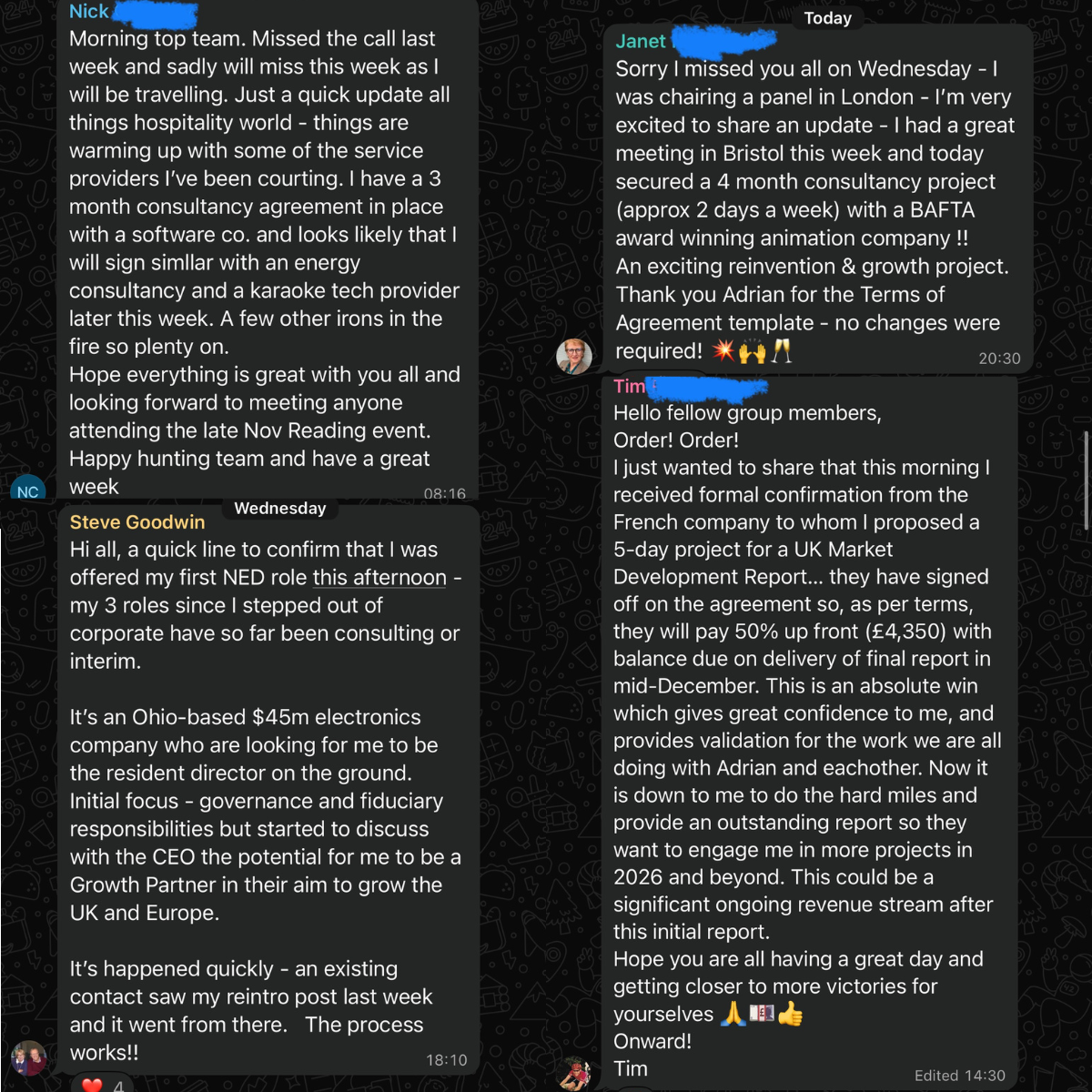 These are anonymised screenshots from our private WhatsApp community.